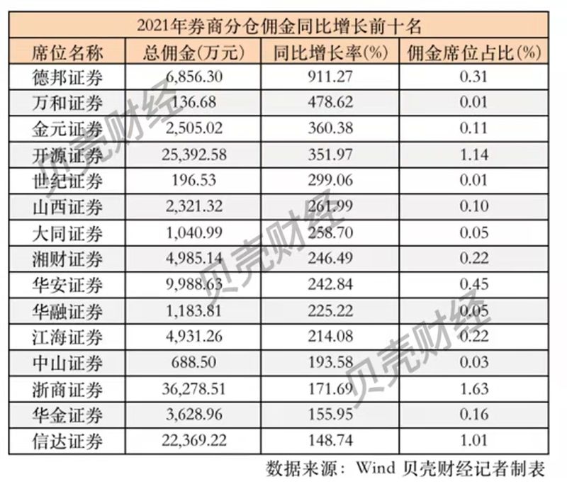 2021年有近30家券商基金分仓佣金收入实现同比超过100%增长,值得注意的是,这些券商多为中小券商,其中,德邦证券实现基金分仓佣金收入0.69亿元,同比大增911.27%;万和证券、金元证券、开源证券紧随其后,基金分仓佣金收入同比增幅均超300%。