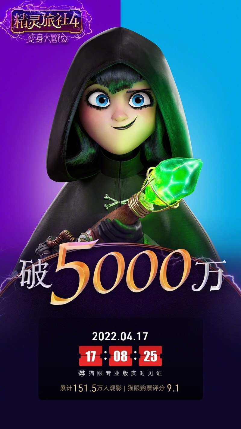 新京报讯 4月17日,据猫眼专业版数据,截至17时8分25秒,电影《精灵旅社4:变身大冒险》(以下简称《精灵旅社4》)票房突破5000万元。