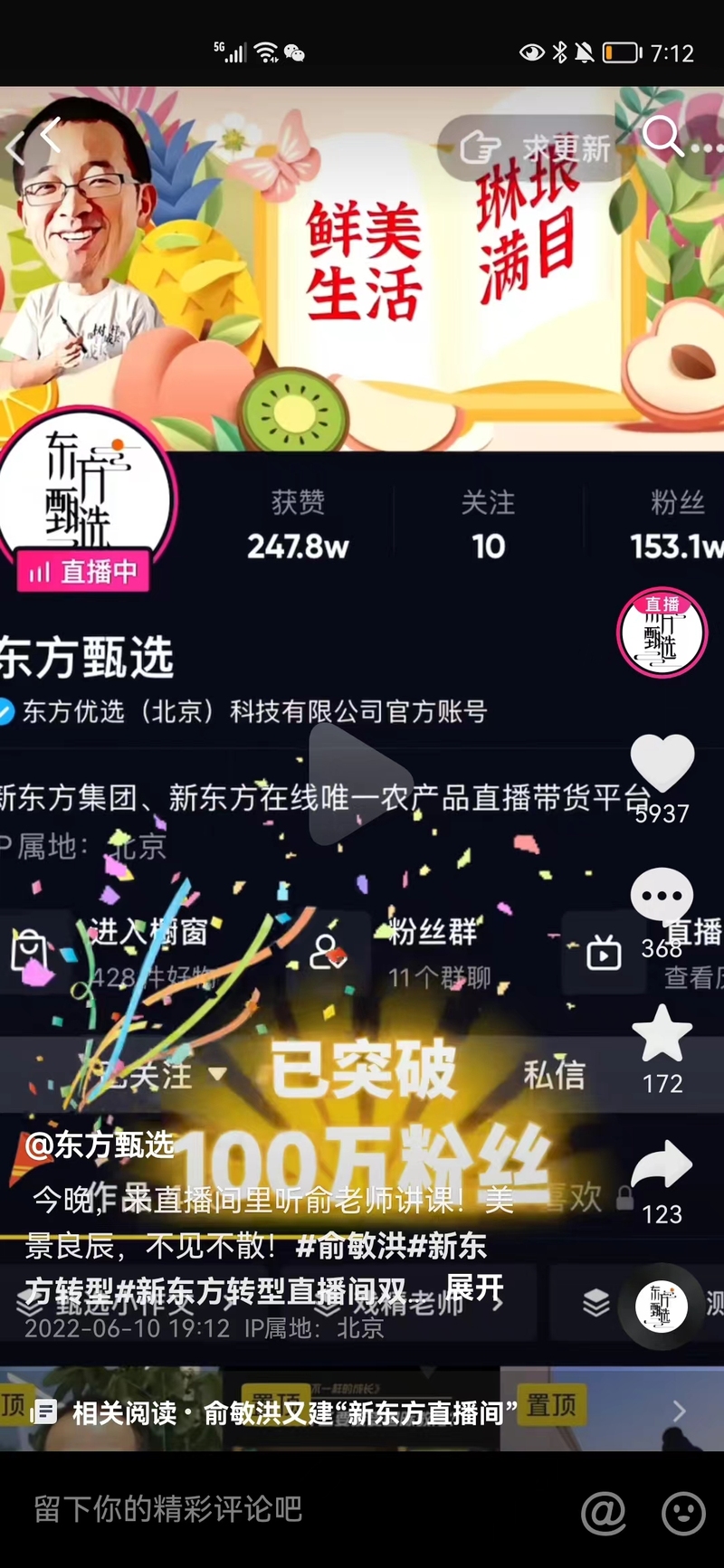 时间回转到2021年12月,新东方在抖音上创建了专注农产品直播的“东方甄选”账号。2021年12月28日新东方推出直播带货新平台“东方甄选”,正式开启直播带货。新东方教育集团创始人俞敏洪表示,自己将不定期出现在东方甄选的直播平台上。