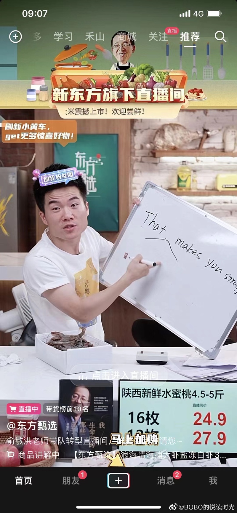 双语无缝切换的主播,手拿写满英文单词的白板,乍一看还以为是英语课堂,仔细一看是新东方的“东方甄选”的直播间。与以往带货主播所喊“家人们、宝宝们”的情形不同,在新东方的直播间中,