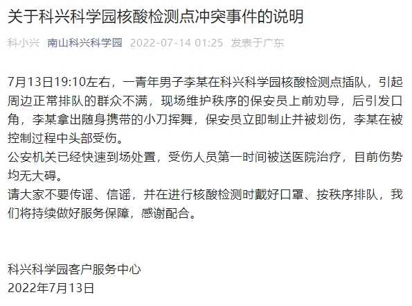 新京报讯 据深圳市南山科兴科学园官微消息,7月13日19:10左右,一青年男子李某在科兴科学园核酸检测点插队,引起周边正常排队的群众不满,现场维护秩序的保安员上前劝导,后引发口角,李某拿出随身携带的小刀挥舞,保安员立即制止并被划伤,李某在被控制过程中头部受伤。