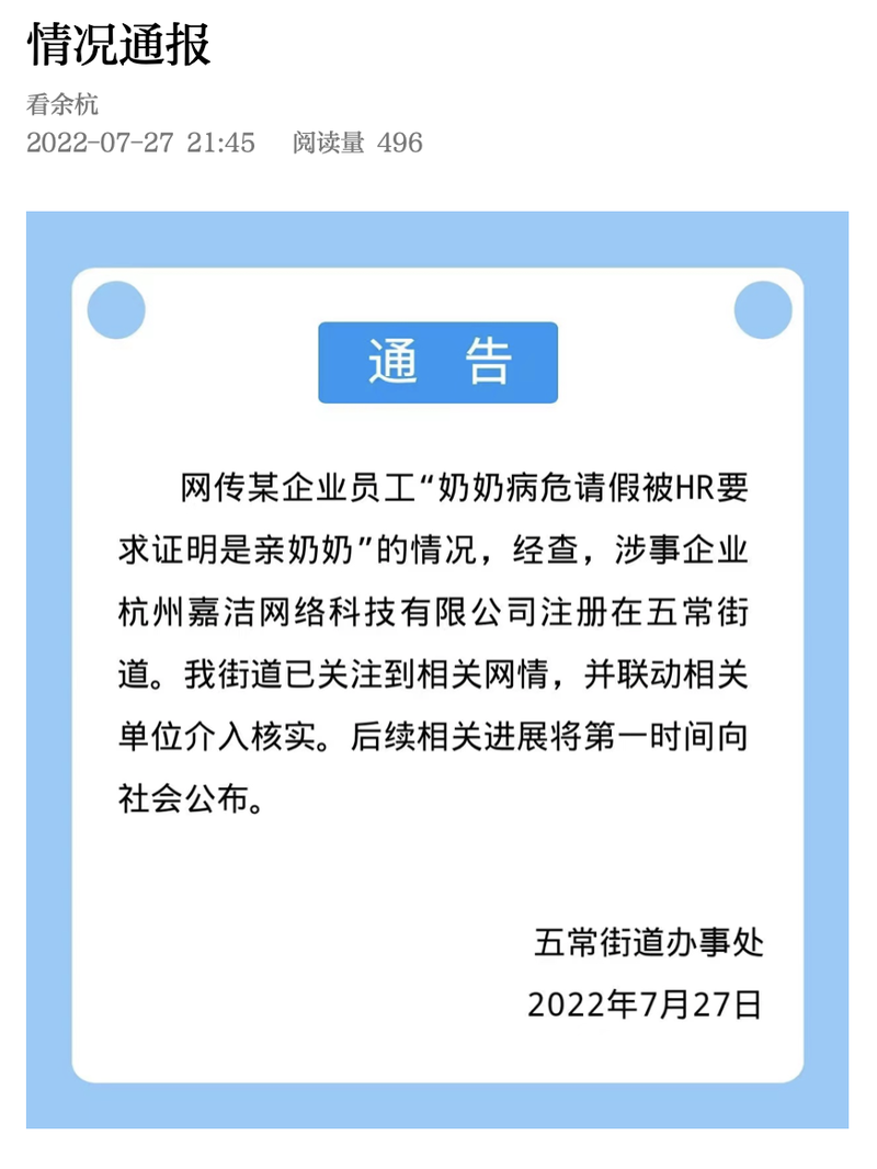 新京报讯 7月27日晚,看余杭客户端就网传“杭州一企业员工奶奶病危请假被要求证明是亲奶奶”一事发布情况通报。全文如下:
