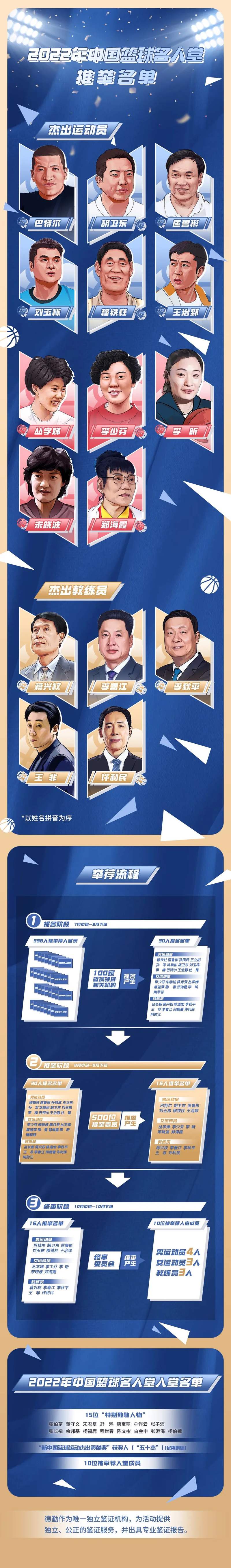 中国篮球名人堂举荐活动分为提名、推举和终审三个阶段,全过程邀请德勤作为唯一独立鉴证机构,提供独立、公正的鉴证服务,并出具专业鉴证报告。
