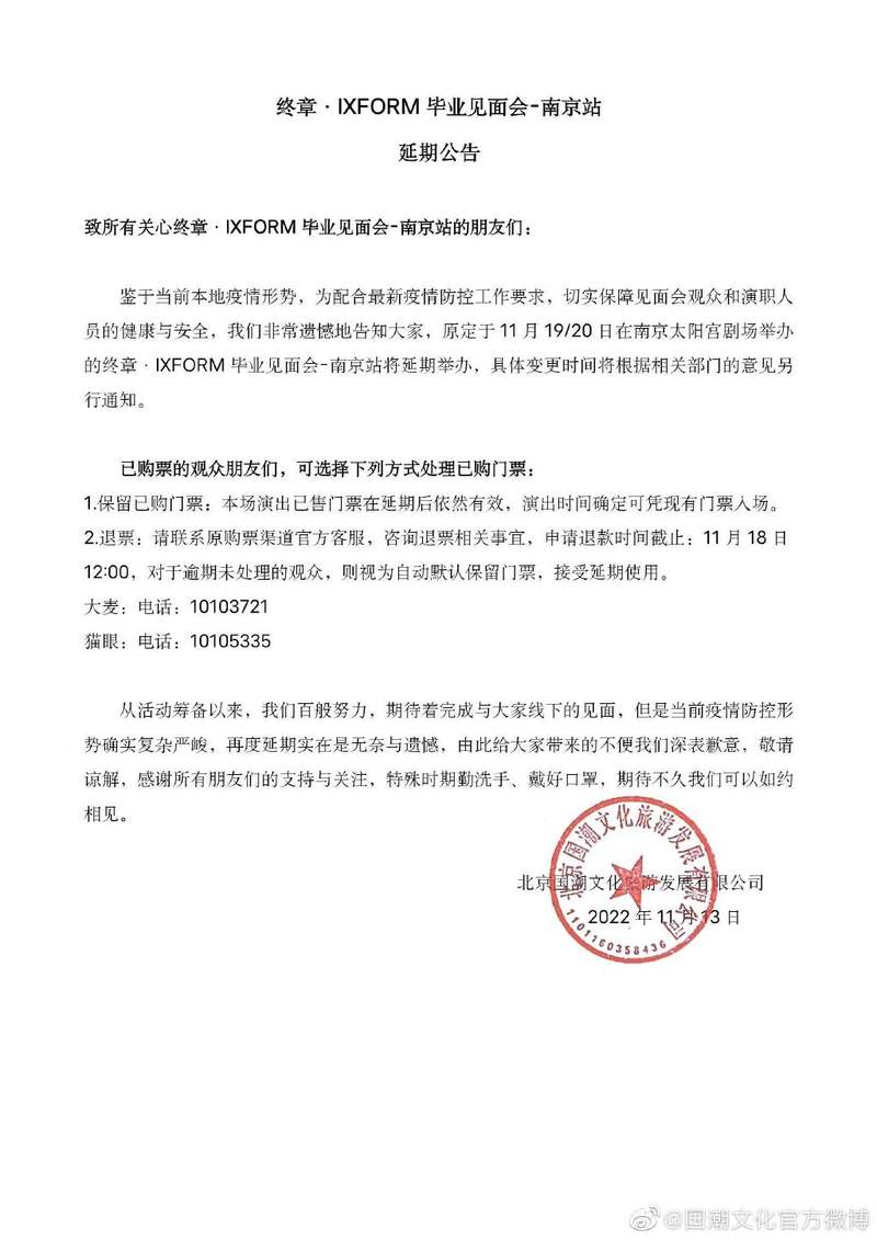 新京报讯 11月13日,IXFORM官方微博发布消息:“因不可抗因素,终章·IXFORM毕业见面会-南京站延期举办。”据悉,该活动原定于11月19/20日在南京太阳宫剧场举办,具体变更时间将另行通知。图片来自官方微博中国内地流行乐男子限定组合IXFORM于2021年7月成立,由罗一舟、唐九洲、连淮伟、刘冠佑、邓孝慈、孙滢皓、刘隽(队长)、段星星、孙亦航九名成员组成。编辑 徐美琳校对 赵琳 247 +1 微博 微信 我要评论 登录 直播 预告 直播丨事关健全药价形成机制,国新办举行国务院政策例行吹风会 2026-04-15 10:00 预 告 第三轮回天行动计划新闻发布会 2026-04-15 15:00 热点 1 经营质量稳定向好,长安汽车交出“质效双升”成绩单 38.1万 2 一图读懂丨慢充、快充、超充……新能源汽车充电该怎么选? 7.9万 3 伊朗要求巴林、沙特阿拉伯等五个中东国家赔偿战争损失 4.1万 4 科技、国潮、绿色,第六届消博会如何点亮消费新未来? 3.9万 5 愚公子:憋闷很正常,人不可能每天醍醐灌顶 3.5万 最新 上万美军人员正在执行封锁进出伊朗港口船只的任务 1小时前 京东、深蓝高管详解国民好车2.0:不做网约车,专项开发增程版 1小时前 以黎代表在华盛顿举行会谈 2小时前 “一站式”问诊过敏性疾病,北京中医药大学给出“北中医方案” 2小时前 “出海”势头强劲,一季度上海南港国产新能源车出口同比增长176% 2小时前 热议 首季增速15%,我国外贸起势有力、开局良好 越共中央总书记、国家主席苏林乘高铁赴雄安新区参访 伊朗战事对我国进出口有何影响?海关总署回应 一季度外贸成绩单出炉:超11万亿元,创下“首次” 上万美军人员正在执行封锁进出伊朗港口船只的任务