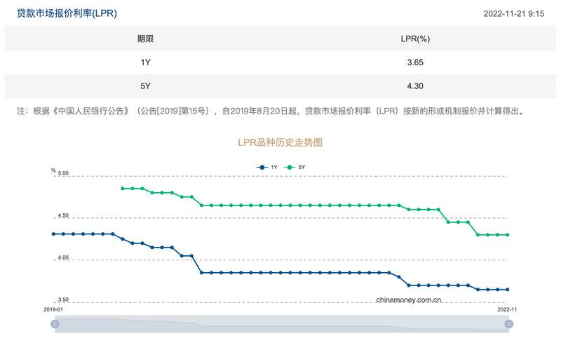 全国银行间同业拆借中心11月21日公布新版贷款市场报价利率(LPR)显示,1年期品种报3.65%,5年期以上品种报4.30%。这意味着LPR已连续3个月按兵不动。