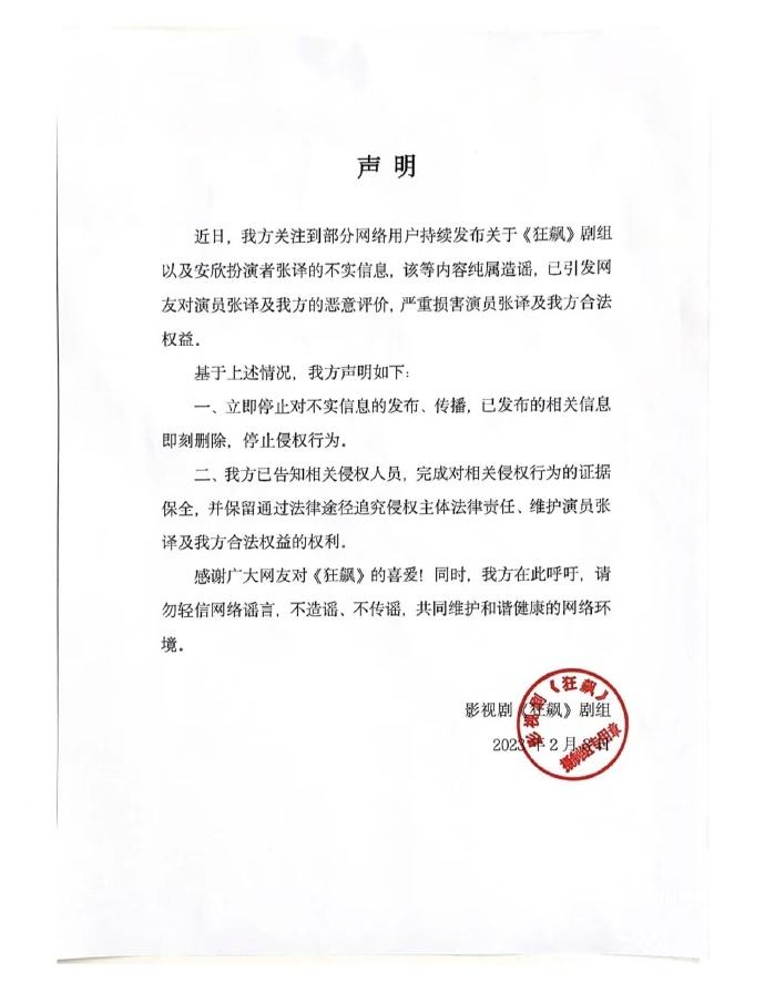 新京报讯 2月3日,《狂飙》剧组在其官博发布声明,称部分网络用户持续发布关于《狂飙》剧组及安欣扮演者张译的不实信息,该等内容纯属造谣。以下为声明全文:编辑 孙琳智 来源:剧集《狂飙》官方微博 504 +1 微博 微信 我要评论 登录 166****6255 1169天前 人红是非多 更多评论请在客户端查看> 相关推荐 算力狂飙背后,储能正在接管电力稳定性 零碳研究院 1.4万 油价狂飙,冲锋衣成最大 “受害者” 财经看见 6960 年卖4.6亿颗芯片,傅里叶冲刺港股:狂飙之下仍有隐忧 独角鲸科技 5645 时速80公里!狂飙的租赁小电驴须立即刹车 | 新京报快评 快评 8022 3·15晚会丨租赁电动自行车“狂飙”,哈啰租电动车等被点名 第一看点 7244 直播 预告 直播丨2026雁栖湖春季帆船赛 体验怀柔湖光花影千帆竞争 2026-04-18 13:00 预 告 直播丨明星挑战老爷车 参与明星车手与百年老车的趣味互动 2026-04-18 09:30 预 告 直播丨走进北京市商业学校 2026-04-20 10:00 预 告 第43届潍坊国际风筝会暨潍坊风筝嘉年华启幕 2026-04-18 09:30 热点 1 长城欧拉5限定版售价13.38万元,侯明昊参与共创 4.5万 2 “小模型”折射大格局:第二十四届中国国际模型博览会在京开幕 3.2万 3 视频|航模爱好者注意了!亚洲顶尖模型盛会今日在北展开幕 3.0万 4 IPO新观察|富印新材过会,本周北交所IPO审四过三 2.4万 5 春满京城 | 景山公园“牡丹路”,九大色系、十大花型一应俱全 2.1万 最新 中央戏剧学院搭建全球交流平台,国际偶剧教育联盟正式成立 7小时前 北京市举办2026年轨道交通工程岗位技能竞赛 7小时前 张雪机车WSBK荷兰站排位赛获得第二名 8小时前 石河子遇沙尘暴天气,实拍沙墙向前推进,当地发布沙尘暴橙色预警 8小时前 具身智能困于数据孤岛,京东为何入局第一视角数据赛道? 8小时前 热议 我国核电总装机容量达到1.25亿千瓦 居全球第一 神舟二十一号航天员乘组圆满完成第三次出舱活动 新闻8点见丨第十六届北京国际电影节开幕;黎以将停火10天 一游客爬上泰山“五岳独尊”石刻拍照 景区:将核查其身份并处理 中央戏剧学院搭建全球交流平台,国际偶剧教育联盟正式成立