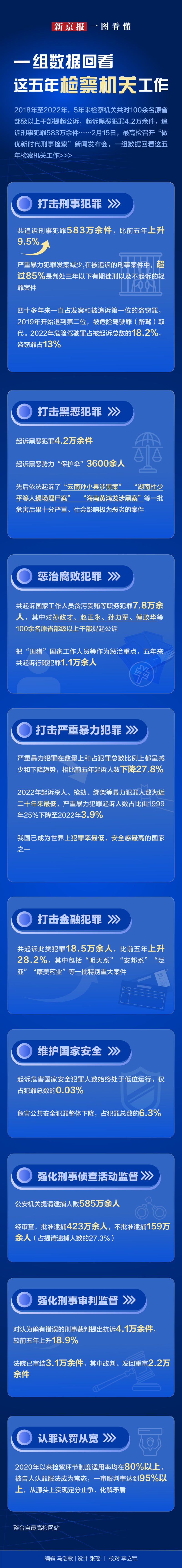 2018年至2022年,5年来检察机关共对100余名原省部级以上干部提起公诉,起诉黑恶犯罪4.2万余件,追诉刑事犯罪583万余件……2月15日,最高检召开“做优新时代刑事检察”新闻发布会,一组数据回看这五年检察机关工作>>>
