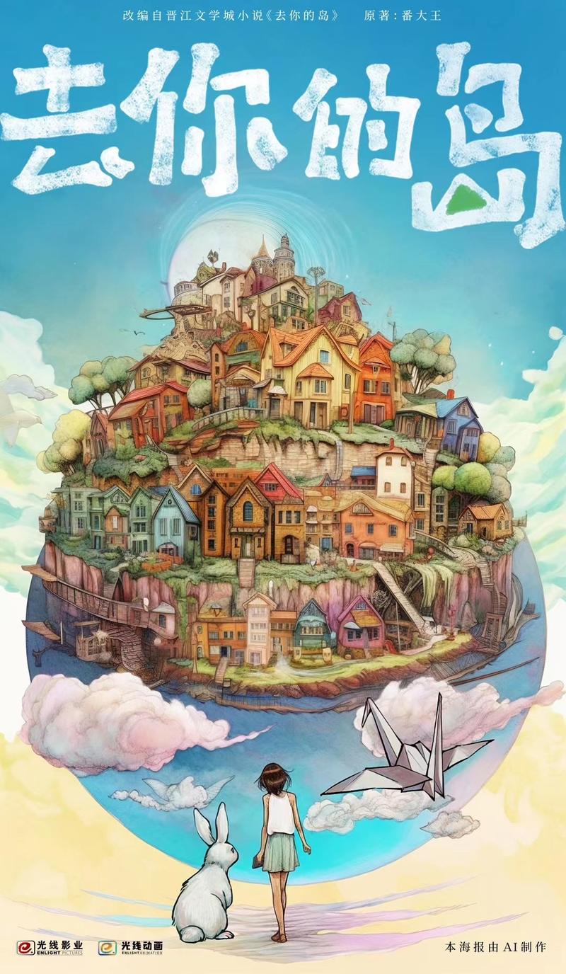 新京报讯(记者滕朝)3月22日,由北京光线影业、光线动画有限公司联合出品的动画电影《去你的岛》发布海报,正式官宣同名人气小说将改编成动画电影。海报上,一个瘦削但坚定的赤脚女孩正望向兔子岛的方向,兔子岛从海水的中间升起。少女和兔子望向小岛,千纸鹤陪伴在他们身旁,整幅画面清新而唯美,充满了童话气息。据悉,这张海报图全程由AI制作,将开启探索未来AI+电影制作的新可能。