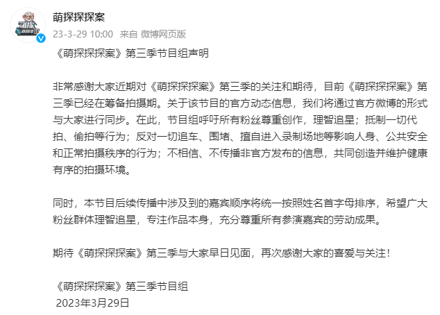 新京报讯 3月29日,《萌探探探案》第三季节目组发布声明,表示节目已在筹备拍摄,呼吁所有粉丝尊重创作,理智追星;抵制一切代拍、偷拍等行为;反对一切追车、围堵、擅自进入录制场地等影响人身、公共安全和正常拍摄秩序的行为;不相信、不传播非官方发布的信息,共同创造并维护健康有序的拍摄环境。