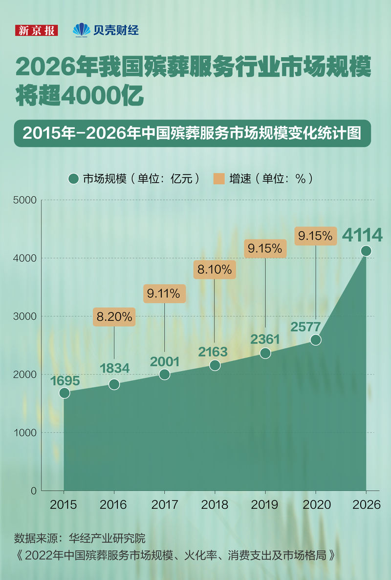 有机构测算,中国2026年殡葬服务行业市场规模将达到4114亿元。殡葬行业朝绿色低碳发展是大势所趋,多家殡葬上市企业布局“互联网+殡葬”服务。