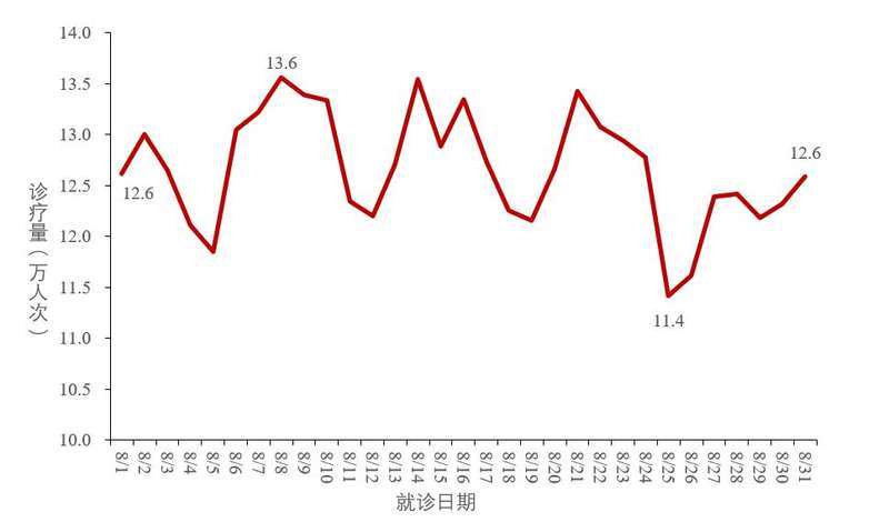2023年8月1日-8月31日,全国31个省(自治区、直辖市)及新疆生产建设兵团日均发热门诊(诊室)诊疗量在12.5万左右波动。