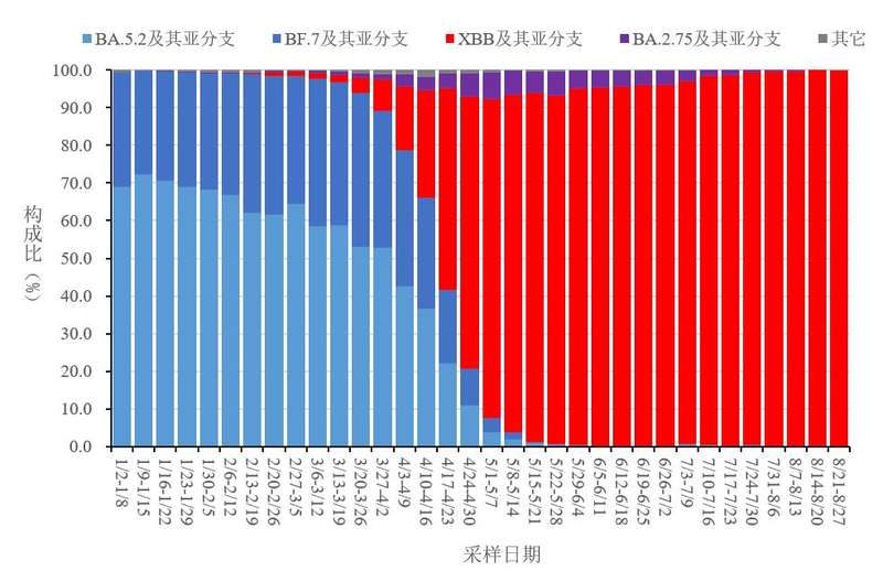 根据采样日期,8月份XBB及其亚分支的占比小幅波动增加,2023年第31周(7月31日-8月6日)为99.6%,第34周(8月21日-8月27日)为99.8%。