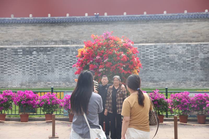 皇乾殿北侧,由天坛养花人多年研究培育的五色叶子花繁花簇簇,吸引了众多游客拍照。五色叶子花树高2.8米,花型小巧。养花师傅选取了20年以上小叶紫母本叶子花,并选用红雀、粉雀、金雀、橙雀、婴儿玫瑰5个品种进行嫁接,经过5年以上的精心栽培,才形成一树五色花开的独特景观。