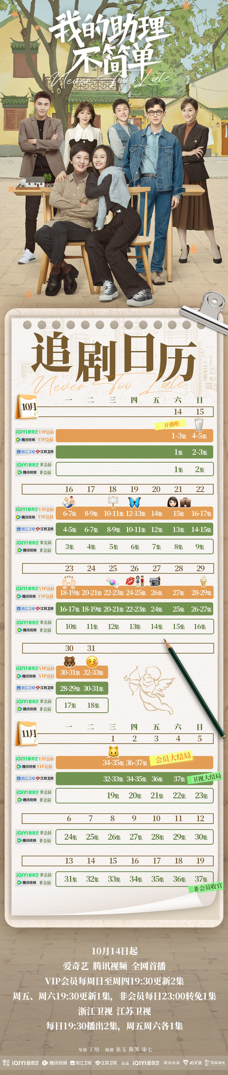 新京报讯 10月14日,电视剧《我的助理不简单》发布追剧日历。该剧从10月14日起在爱奇艺、腾讯视频全网首播,VIP会员每周日至周四19:30更新2集,周五、周六19:30更新1集,非会员每日23:00转免1集;浙江卫视、江苏卫视每日19:30播出2集。该剧11月2日平台会员大结局,11月4日卫视大结局,11月19日平台非会员收官。