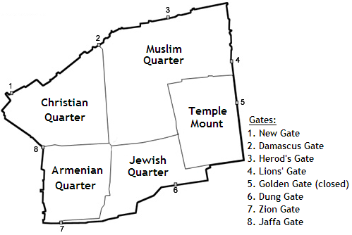 如今的耶路撒冷被分为基督徒区,亚美尼亚区,犹太区和穆斯林区。基督徒区,亚美尼亚区和犹太区位于西部 ,穆斯林区位于城市东北部。