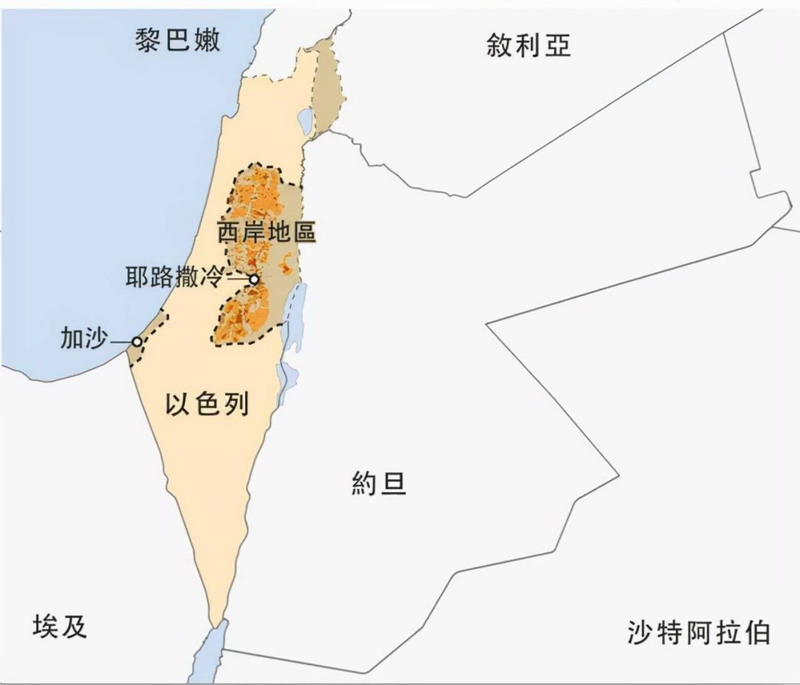 目前,巴勒斯坦和以色列的边境大约集中在加沙以及约旦河西岸,巴勒斯坦的国土被以色列分割为两个不相邻部分。