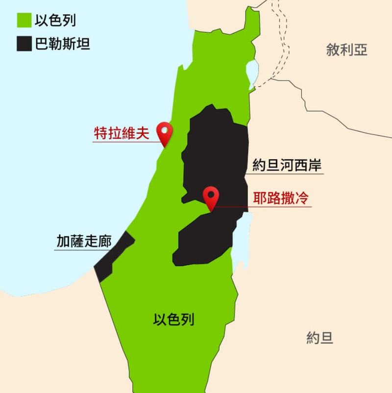 而耶路撒冷则处于以色列、巴勒斯坦的边境地区。