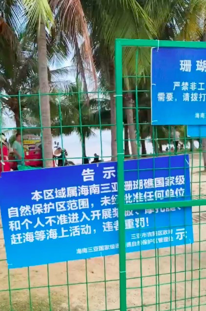 网传视频显示,保护区设有围栏,但门被打开,人员可随意进出。保护区内,不少人在打捞海产品,有摊贩售卖水果、经营海上项目等。围栏上挂着告示牌:本区域属海南三亚珊瑚礁国家级自然保护区范围,未经批准任何单位和个人不准进入开展桨板、摩托艇、赶海等海上活动,违者重罚。