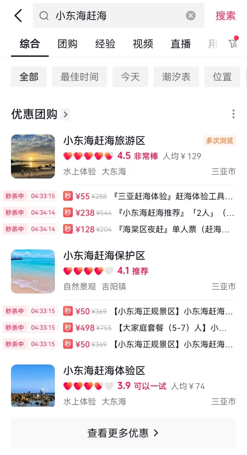新京报记者在某电商平台搜索“小东海赶海”,发现平台提供多个小东海赶海旅游区、保护区、体验区的“优惠团购”。记者联系一家名为“小东海赶海旅游区”的商家,对方称,“虽然保护区内不让进,但是每天依然有很多人进去玩,会有工作人员巡逻,他们走了之后就可以继续玩。”