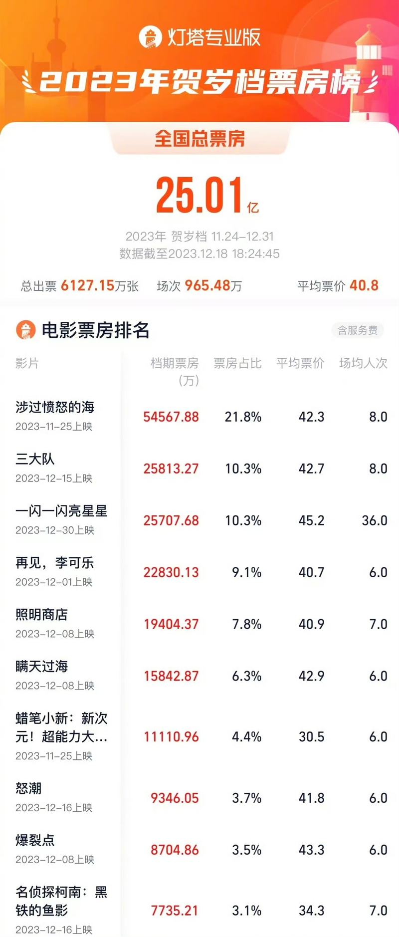 新京报讯(记者滕朝)据灯塔专业版数据,截至12月18日18时,2023年贺岁档(11月24日-12月31日)含预售票房突破25亿,《涉过愤怒的海》《三大队》《一闪一闪亮星星》暂列档期票房前三,票房分别为5.45亿、2.58亿、2.57亿。
