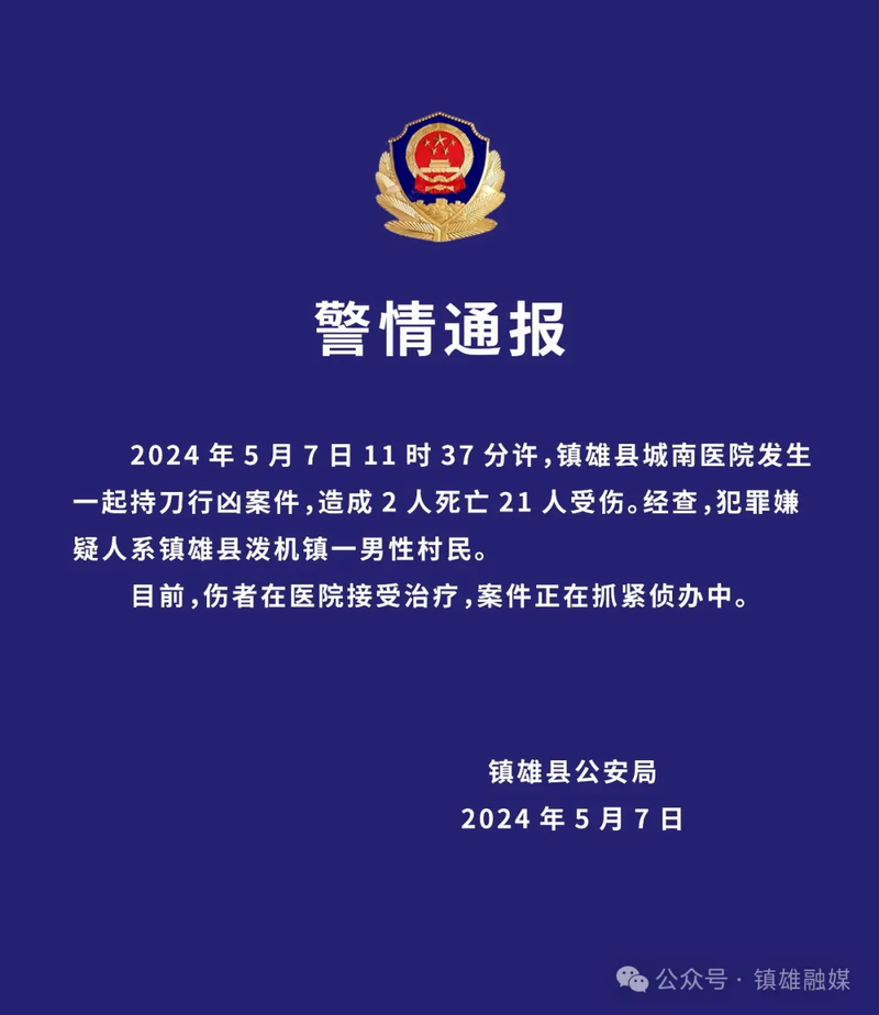 新京报讯 据镇雄融媒官微消息,2024年5月7日11时37分许,镇雄县城南医院发生一起持刀行凶案件,造成2人死亡21人受伤。经查,犯罪嫌疑人系镇雄县泼机镇一男性村民。