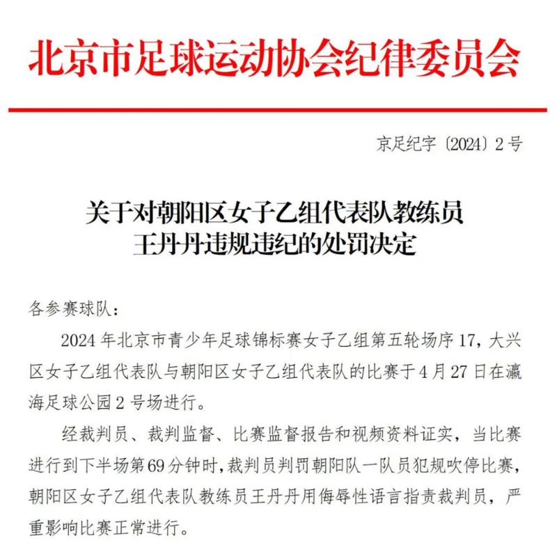 新京报讯 5月22日,北京市足协开出罚单:朝阳区女子乙组代表队教练员王丹丹因在比赛中用侮辱性语言指责裁判,决定对其处以禁赛9个月,罚款4500元的处罚。编辑 王春秋 质疑、内耗、共情、强大,90后中国足球女裁判成长史 181 +1 微博 微信 我要评论 登录 直播 预告 直播丨介绍《关于加快建设分级诊疗体系的若干措施》有关情况 2026-04-13 10:00 热点 1 机器人半马|数十支队伍深夜“拉练” 11.7万 2 视频|直击人形机器人半马深夜测试,更快更稳! 7.4万 3 打虎!丁业现被查 4.3万 4 昨夜今晨,机器人和人类分别在北京跑了一场半程马拉松 3.2万 5 西藏自治区人大常委会原副主任丁业现被查 2.1万 最新 张雪:如果有机会拿总冠军,就请客包机去看比赛 6分钟前 从千年国色到百亿产业,菏泽牡丹带动全域共兴 7分钟前 研究生住“800万豪宅”,先别羡慕误会大了 | 新京报专栏 11分钟前 探营|机器人半马夜测:四成赛队自主奔跑,追赶人类运动员 19分钟前 伊朗:霍尔木兹海峡在严密监控与完全掌控之下 23分钟前 热议 视频|直击人形机器人半马深夜测试,更快更稳! 中国篮协正在核查篮坛新秀年龄存疑一事 伊美第三轮谈判已结束 双方存在严重分歧 伊朗:霍尔木兹海峡在严密监控与完全掌控之下 探营|机器人半马夜测:四成赛队自主奔跑,追赶人类运动员
