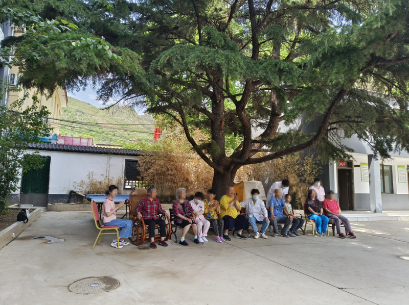 北京仙栖谷精神障碍托养中心内,学员们在大树下乘凉,医护人员在一旁照护。 新京报记者 叶红梅 摄