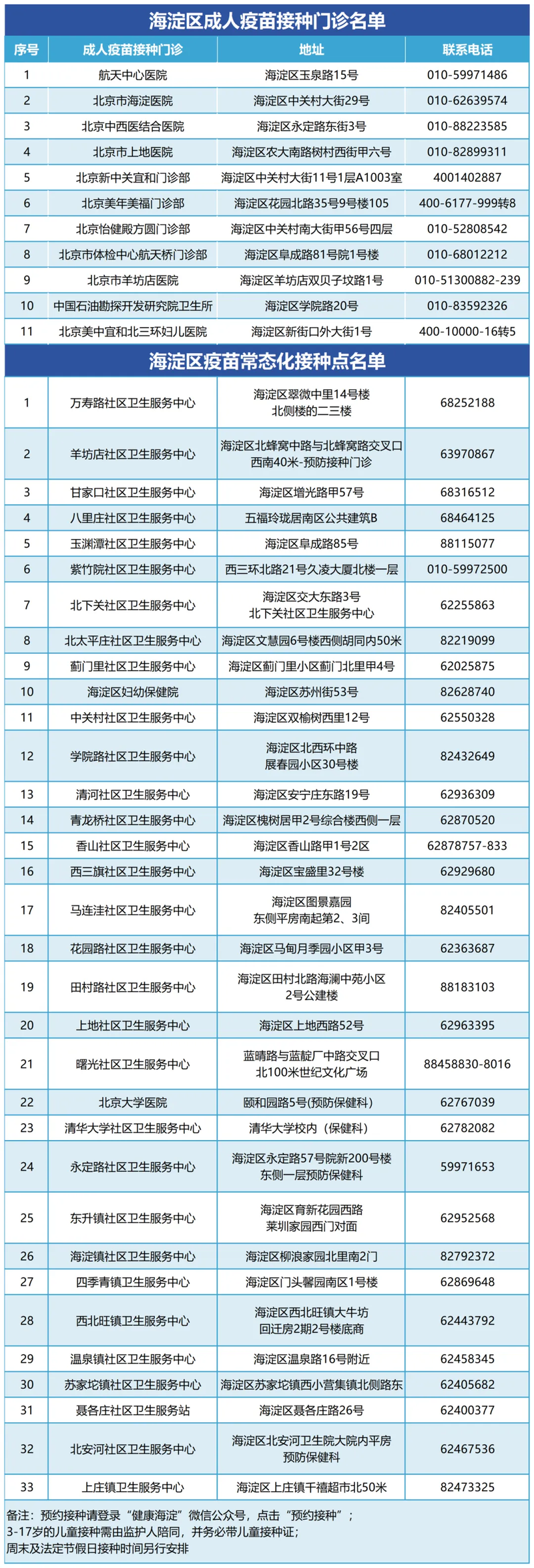 附:海淀区成人疫苗接种门诊名单及疫苗常态化接种点名单
