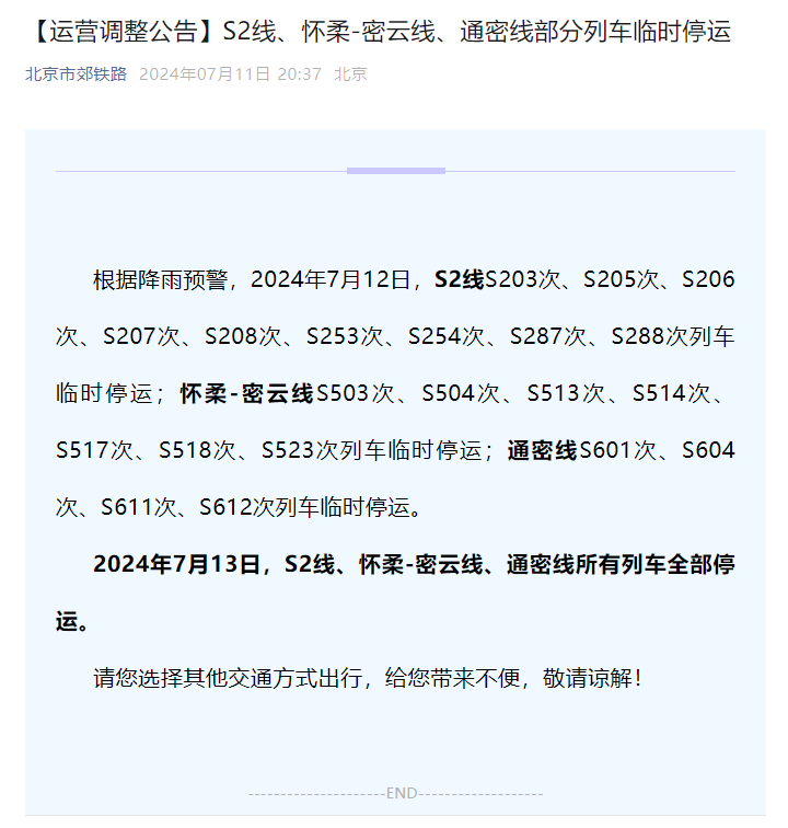 2024年7月13日,S2线、怀柔-密云线、通密线所有列车全部停运。