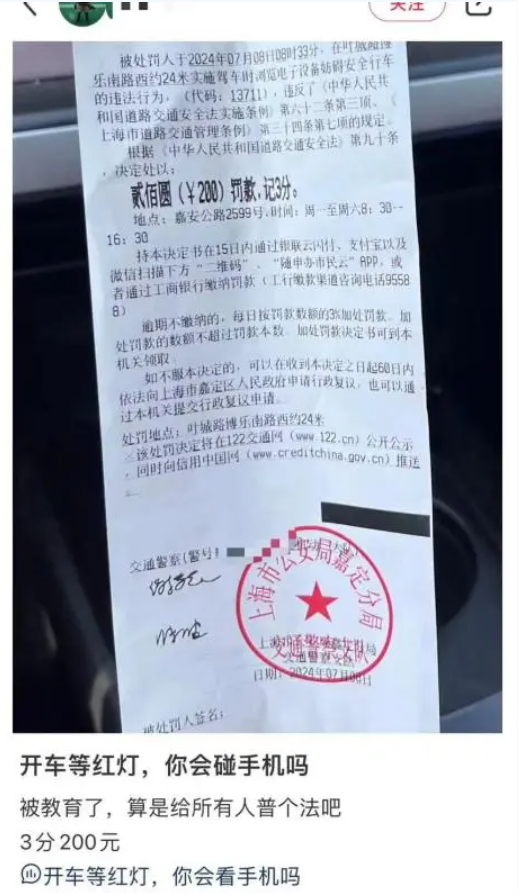 据极目新闻报道,7月8日,有网友在社交平台晒出一张罚款单。罚单上注明,被处罚人于2024年7月8日8点,在上海叶城路某路口,实施驾车时浏览电子设备妨碍安全行车的违法行为,该行为违反了《中华人民共和国道路交通安全法实施条例》和《上海市道路交通管理条例》相关规定。最终,当事人被处以罚款200元扣3分。随即帖子引发网友热议,有网友疑惑,“等红灯也不能看手机吗?”