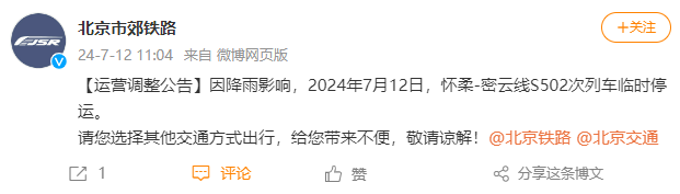 新京报讯 据北京市郊铁路官博消息,因降雨影响,2024年7月12日,怀柔-密云线S502次列车临时停运。请您选择其他交通方式出行,给您带来不便,敬请谅解!相关阅读:7月12日至13日,北京市郊铁路这些列车临时停运编辑 李忆林子 点赞 +1 微博 微信 我要评论 登录 直播 预告 直播丨国新办发布会 介绍2026年一季度工业和信息化发展情况 2026-04-21 10:00 热点 1 比赛突然提前结束,张雪机车WSBK荷兰站第二回合正赛第七名 10.0万 2 200余亩油菜花盛放,丰台王佐镇怪村花海文化节启幕 1.7万 3 山东省青岛市委常委、副市长王波被查 1.7万 4 花坛藏尸28年:嫌犯整容换面,儿子苦寻半生 1.6万 5 美伊战火之外的黎巴嫩:一个被“遗忘”的战场 1.2万 最新 关于中华人民共和国履行《不扩散核武器条约》情况的国家报告 7分钟前 丁俊晖晋级斯诺克世锦赛十六强,将会师赵心童 10分钟前 9问充电器“120W”商标:没注册为何能使用? 12分钟前 一网民在姑姑家附近路灯杆上立牌标明“俺姑家” 镇政府回应 12分钟前 被“小鼻嘎”机器人萌翻了,明知比不过为何还要来?丨城市体验官 16分钟前 热议 一季度用电量增长5.2%,工业与AI双引擎驱动经济回暖 宁德时代:股东询价转让定价为410.34元/股 3·15消化酶调查追踪:监管明确禁直接食用,产品大面积召回 必胜客Pizzeria亮相西四,北京城市微旅行线添“意味” “故宫用猪血镇邪”,别让迷信消解工匠智慧 | 新京报快评