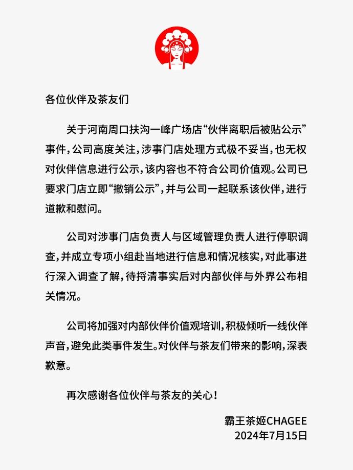 新京报讯 7月15日晚,霸王茶姬就“员工离职后被贴公示”一事发布情况说明,称涉事门店处理方式极不妥当,对涉事门店负责人及区域管理负责人进行停职调查。以下为全文:编辑 刘佳妮 10 +1 微博 微信 我要评论 登录 186****6630 641天前 侵犯人权行为不可取 139****6697 641天前 要求赔偿 更多评论请在客户端查看> 直播 预告 直播丨走进北京市商业学校 2026-04-20 10:00 预 告 直播丨2026北京亦庄人形机器人半程马拉松 2026-04-19 06:30 热点 1 张雪机车WSBK荷兰站排位赛获得第二名 4.6万 2 “不到2小时卖超100单”,消博会公众开放日现“买买买”热潮 3.2万 3 一个蛋糕为何引出7大平台35.97亿元罚单? 2.5万 4 IPO新观察|富印新材过会,本周北交所IPO审四过三 2.5万 5 国际航班现停飞潮:中东战火为何能“烧”到五一机票? 2.1万 最新 世界杯热潮“燃”进北京商圈,3V3足球嘉年华拉开帷幕 1分钟前 东部战区位东海相关海空域开展联合战备巡航 2分钟前 直击智元合作伙伴大会:迈入部署态元年,具身智能开启生产力时代 6分钟前 四川省副省长徐芝文,已任西藏自治区党委常委、宣传部部长 8分钟前 “百家商会进大兴”活动举办,现场签约11个项目 13分钟前 热议 张杰“鸟巢”连唱16场:我不想预知未来,每一刻都是未来丨专访 诊所被指用同一针头给多人采血 杭州:停业整顿 涉事者被解雇 和田街头的“北京元素” 中国海警位钓鱼岛海域紧急救援中国台湾籍渔船 张雪机车WSBK荷兰站排位赛获得第二名