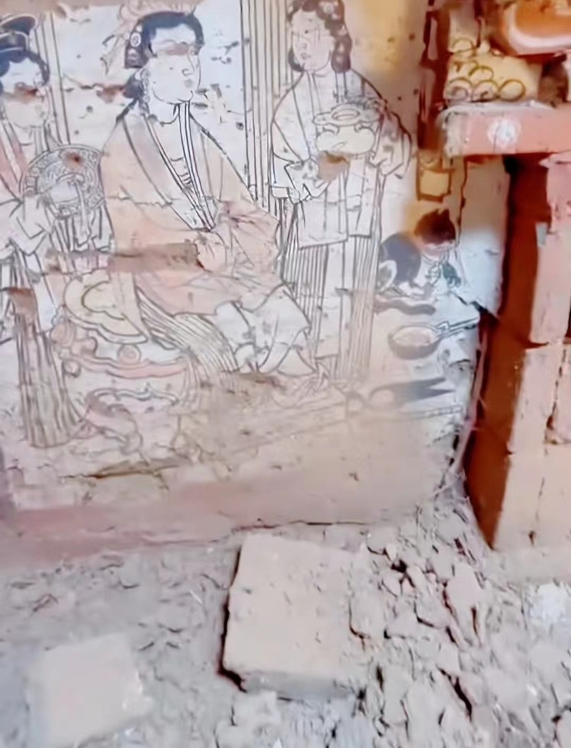 网友拍摄的视频显示,一处地下深坑中,上部为砖石结构的穹顶,内部有大量颜色鲜艳的人物、云纹壁画。