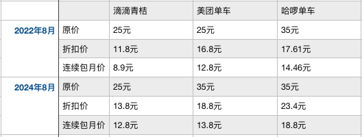 追溯至2022年8月,三大共享平台在北京部分地区折扣价为11.8元-17.61元。这也就意味着,最高已涨了将近6元。对于连续包月来说,低至8.9元的个位数收费早已消失。