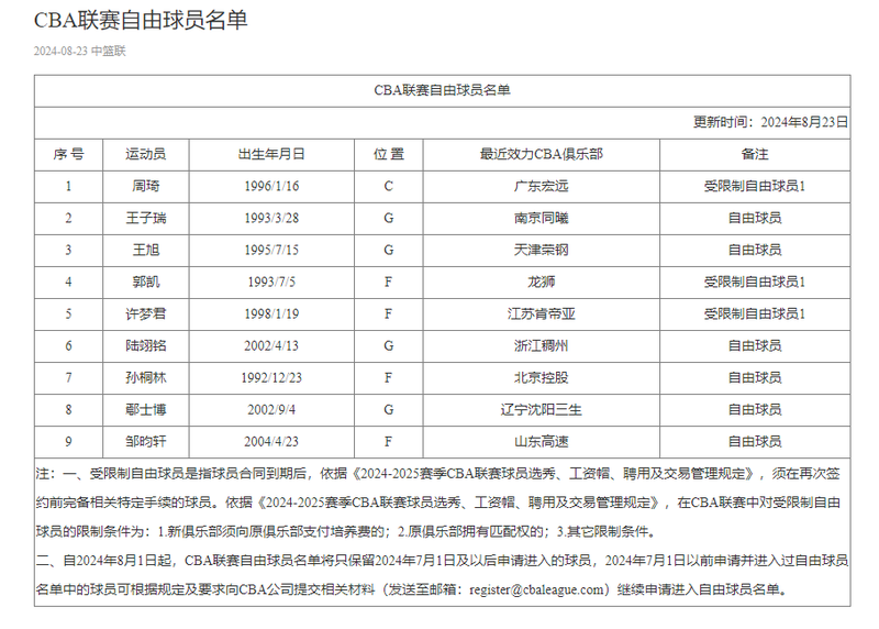 据央视体育消息,北京时间8月23日,CBA官方更新了联赛自由球员名单,上赛季效力于广东男篮的周琦成为受限制自由球员。