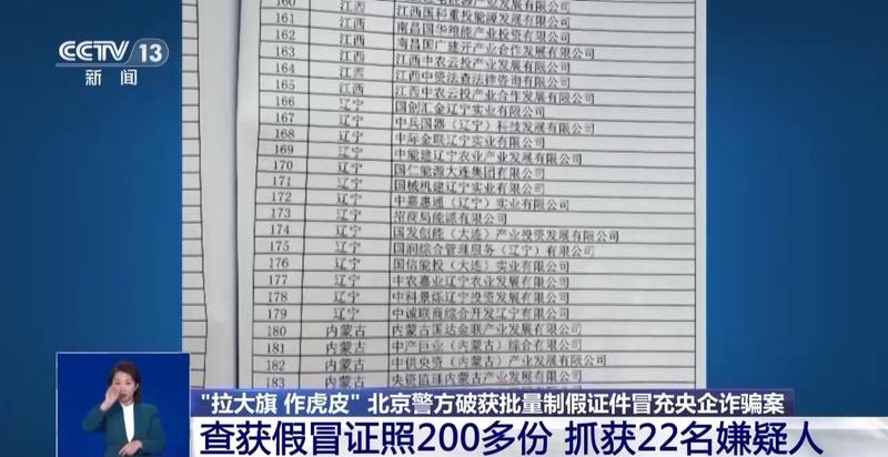 伪造公文印章、制作虚假材料、虚假挂靠央企,不法分子凭借“拉大旗、作虎皮”的手段开展了诈骗行为。这份警方公布的伪造的央企名单,一眼看上去都跟真的似的。北京警方顺藤摸瓜,经过严密侦查,破获了这起批量用假证件注册假国企的犯罪案件,抓获犯罪嫌疑人22名。警方介绍,该团伙制作的假国企央企证照多达200多份。