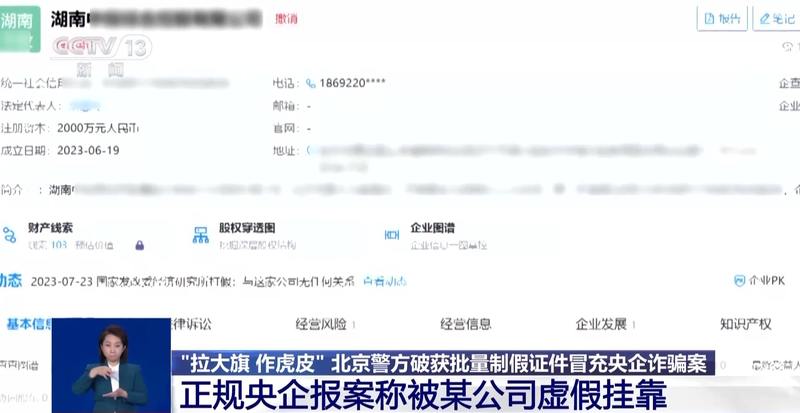 北京市公安局刑侦总队 侦查员:这些假国企在注册的时候会提交相应的法人的授权书,母公司的营业执照以及母公司的法人执照,还有母公司的股权决议,包括同意他设立子公司的一些审批请示之类的材料。所有的这些材料全部都是虚假的,都是他们通过一些修图的手段,包括伪造公文印章的手段,制作的虚假材料。
