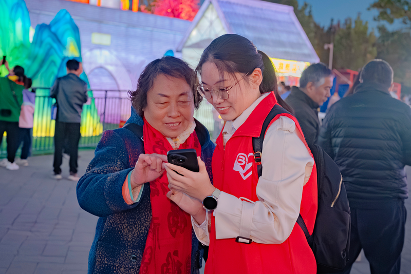 在“京彩灯会”现场,北京银行工作人员教授老年人使用“尊爱版”手机银行。