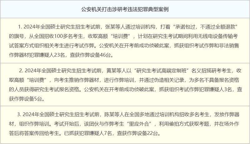 部分辅导机构人员、自媒体通过网络平台发布“交一定费用可实现包录取甚至协助保毕业,不过线不录取就退费”“可在考前获取真题和答案”“有内部指标(计划、名额)确保录取”等信息。还有个别网民在社交平台上宣扬和煽动使用新型作弊手段规避监考。