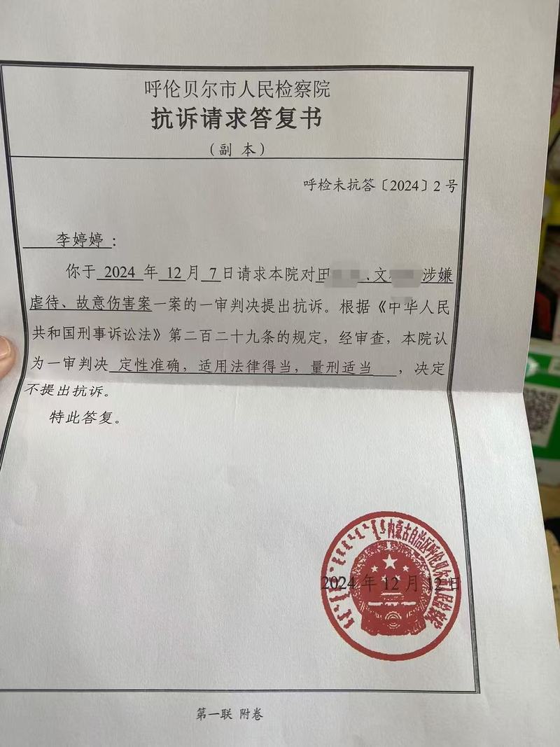 12月12日呼伦尔贝市检察院出具的抗诉请求答复书显示,该院认为对二被告人“定性准确、适用法律得当,量刑适当”,决定不提出抗诉。