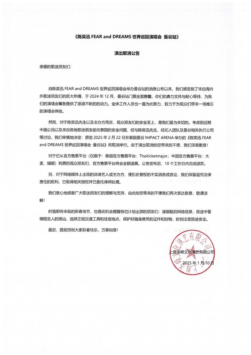 陈奕迅演唱会曼谷站取消 演艺公司:将全额退款