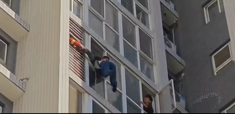 救援现场,多方救援人员合力将男子拉回室内。图源:朝阳警方