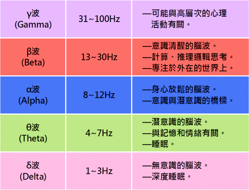 电波根据频率不同,可以分为五类,从低频到高频依次为:δ波、θ波、α波、β波、γ波。每种波段可以对应不同的心理、生理、精神状态。波频越高,越需要调动认知功能,也越能进入专注状态。