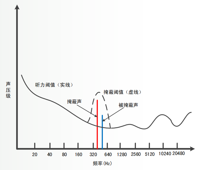 就像下面这张图所示,人耳在正常情况有一条听力阈值线。当掩蔽声出现,会将人耳的听力阈值提高,形成一条新的听力阈值线,此时在这条新线之下的被掩蔽声变得不再能被人耳听到。