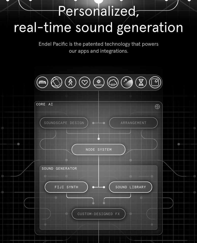 团队自己开发了一个算法叫 Endel Pacific。AI 能根据获取到的用户当下时间、地点、天气、心率等数据,生成让其专注或放松的声音,并非是算法简单从人工制作好的音效库里调配声音。