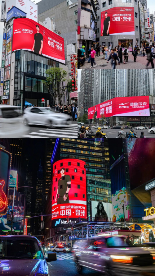 就在官宣签约于适当天,鸿星尔克品牌还登陆全球多地户外巨幕,以震撼之姿亮相美国纽约时代广场、日本东京新宿、韩国首尔东大门等标志性建筑。