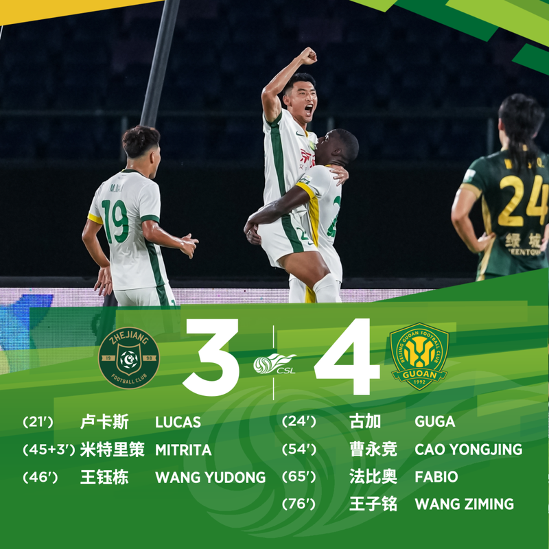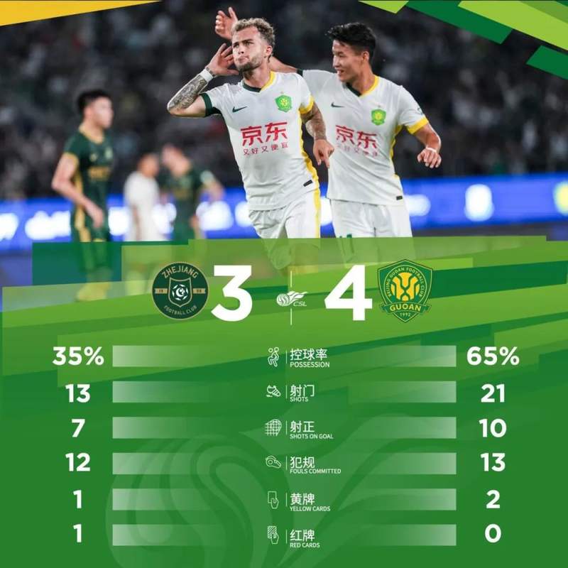 最终,北京国安客场4-3逆转战胜浙江俱乐部绿城队,赢得球队历史上各项赛事的第500场胜利。