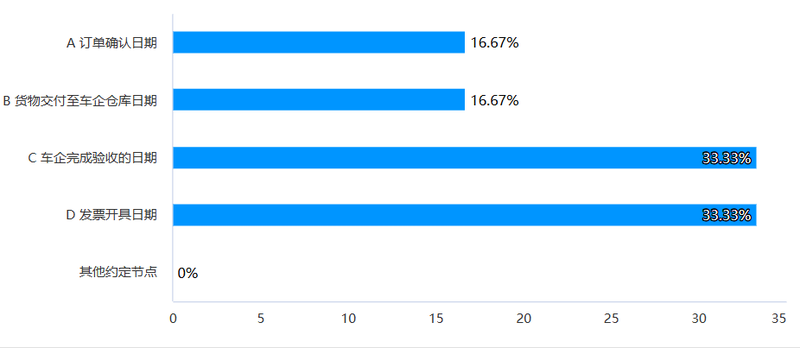 调查问卷显示,分别有33.33%、33.33%、16.67%和16.67%的供应商反映车企以“完成验收的日期”“发票开具日期”“订单确认日期”“货物交付至车企仓库日期”为起算点。这种起算点的模糊和不统一,本身就可能成为变相延长账期的因素。