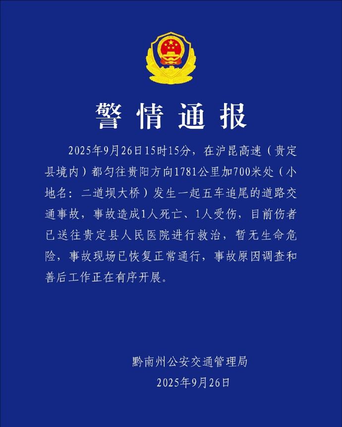 新京报讯 9月26日,贵州省黔南布依族苗族自治州公安局交通警察支队发布警情通报,全文如下:编辑 陈艳婷 点赞 +1 微博 微信 我要评论 登录 热点 1 北京警方提醒苹果用户:谨防此类诈骗 2.2万 2 马文良打破10公里精英赛纪录,夺海淀站冠军 1.7万 3 89岁独居老人被困家中,从27层翻窗爬到21层因体力不支被困 1.4万 4 新疆阿勒泰地区公安机关开展清明节系列祭扫活动 1.3万 5 老人家中夜里突发火情,烟感报警器“发声”引来邻居相救 1.3万 最新 特朗普称7日是同伊朗达成协议的最终期限 6小时前 柬埔寨颁布法律打击电信网络诈骗 6小时前 美媒称美国已收到伊朗关于结束战争的回应 6小时前 伊朗回应美方停战提议,提出10项条款 6小时前 北京细化电动自行车登记要求:转让30天内变更,不再使用要注销 7小时前 热议 北京细化电动自行车登记要求:转让30天内变更,不再使用要注销 伊朗回应美方停战提议,提出10项条款 美媒称美国已收到伊朗关于结束战争的回应 柬埔寨颁布法律打击电信网络诈骗 特朗普称7日是同伊朗达成协议的最终期限