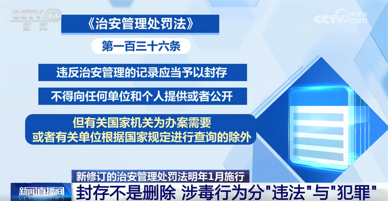 据央视网消息,将于明年1月1日起实施的新修订《中华人民共和国治安管理处罚法》中第一百三十六条确立的“治安违法记录封存制度”近日引发关注,其中,因吸毒有治安处罚记录也在被封存的范围内引发热议。一边是每年超800万曾受治安处罚群体对“摆脱终身标签”的期待,一边是公众对“记录封存是否等同于纵容违法”“是否为特定人群开绿灯”的担忧,围绕这些热点问题,我们来看一看专家怎么说。